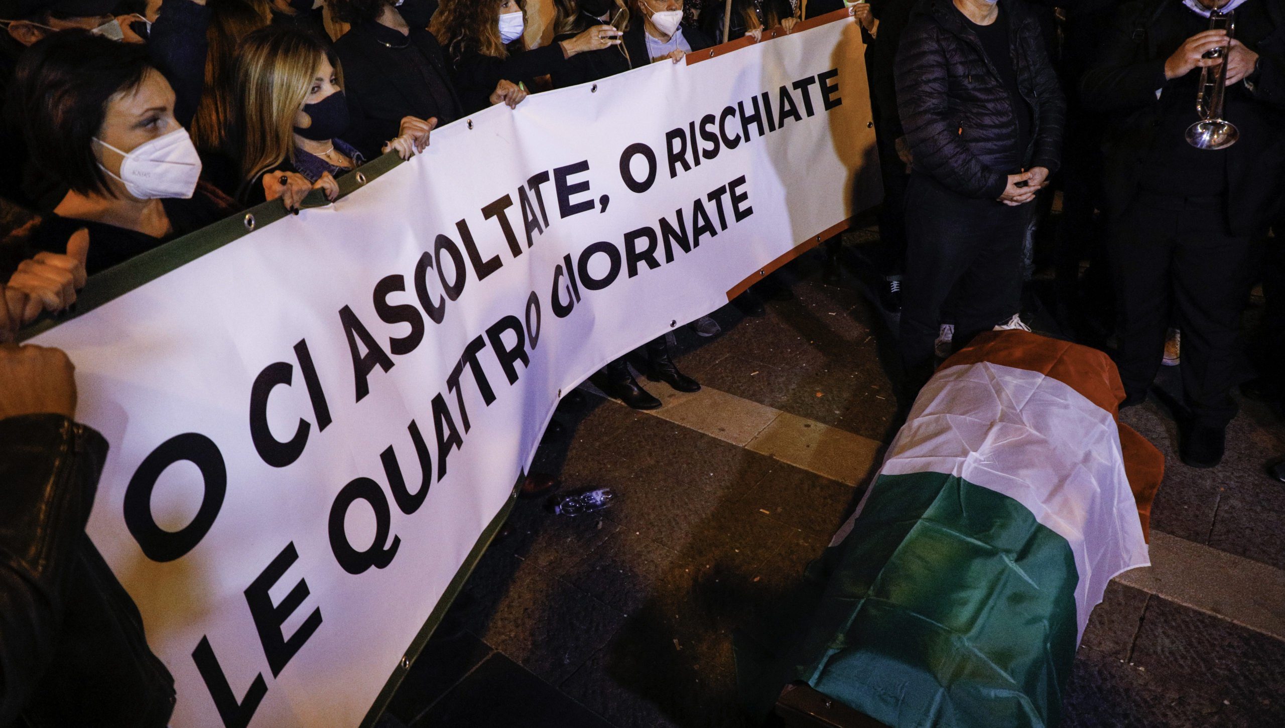 Il feretro tricolore è stato poi posto sotto la regione Campania, luogo simbolo delle Istituzioni. I partecipanti sono stati chiamati a dare l’ultimo saluto a quello che resta dell’economia partenopea, con il sottofondo suggestivo e commovente dell’Inno del silenzio intonato con una tromba.