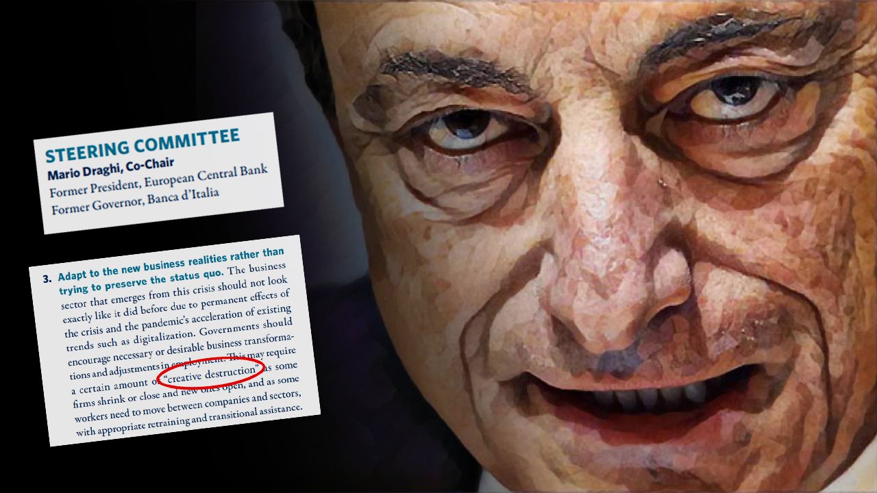 Questi documenti, secondo il Prof. Brancaccio, smentirebbero dunque le voci circa un cambio di rotta nelle ideologie liberiste del Premier incaricato: “Lì Draghi ritorna alle origini liberiste – spiega nella diretta video – perché fondamentalmente dice che i governi dovrebbero smetterla di ostacolare i meccanismi selettivi del mercato e dovrebbero invece favorire quei processi di ‘distruzione creatrice'”.