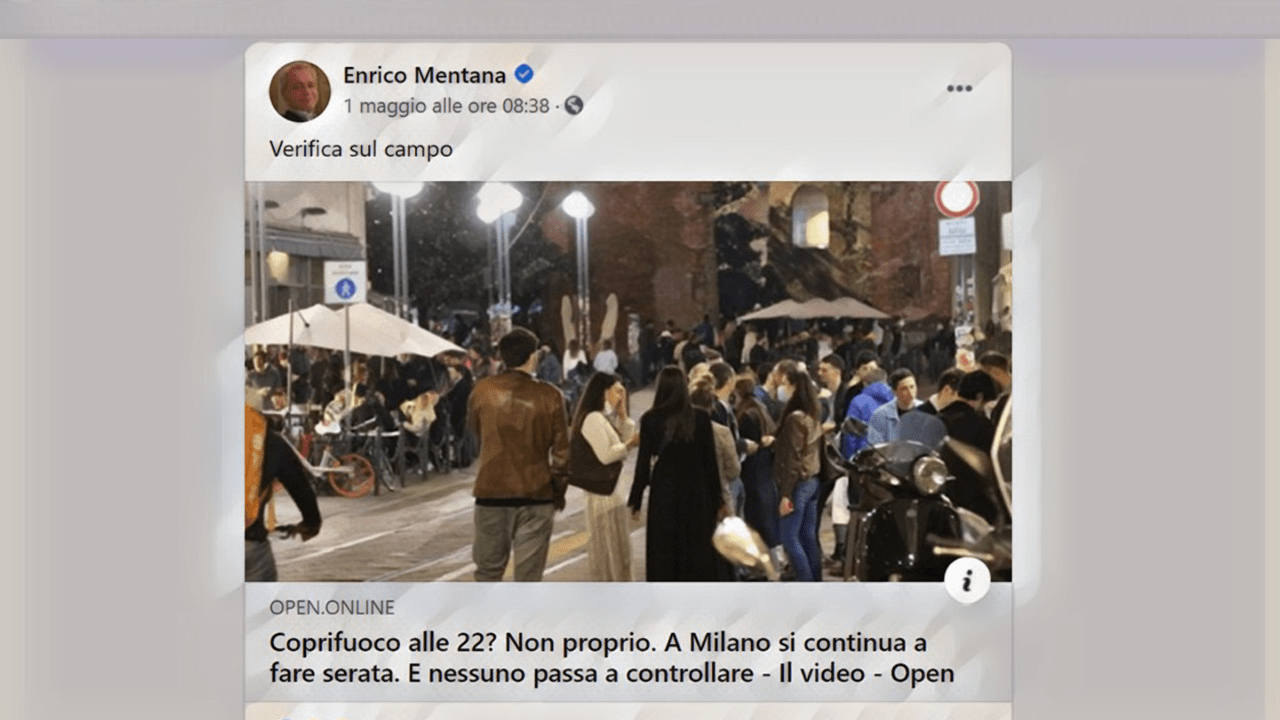 Un destino simile a chi vive nei pressi di Gassman è toccato ora a tutti quei milanesi che sarebbero stati colti fuori dalla propria abitazione dopo le 22.00, violando così il famigerato coprifuoco. Una denuncia partita dalla testata giornalistica Open e rilanciata con un post su Facebook dal suo fondatore Enrico Mentana. Il direttore del Tg La7 scrive letteralmente di una “verifica sul campo”, mentre il suo giornale titola “‘Coprifuoco alle 22? Non proprio. A Milano si continua a fare serata. E nessuno passa a controllare”.