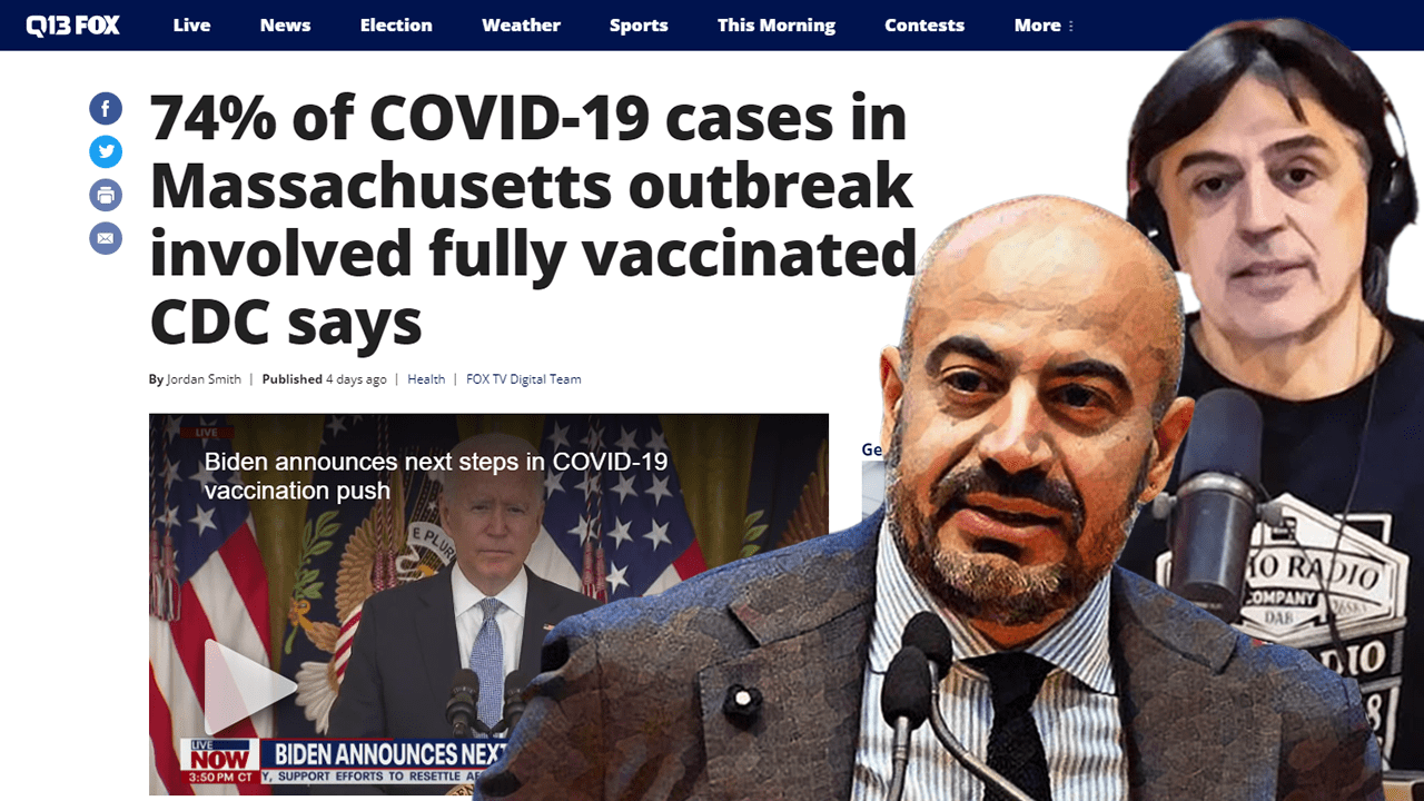 “Possiamo vedere direttamente l’articolo di Fox News: ‘Il 74% dei casi di Covid-19 nell’epidemia del Massachusetts ha coinvolto persone completamente vaccinate, dice il Cdc’. ‘469 persone in quella zona sono risultate positive in questo mese: circa tre quarti, il 74% di loro, erano stati completamente vaccinati. Una persona è considerata completamente vaccinata due settimane dopo aver ricevuto la seconda dose di un vaccino Pfizer o Moderna o una singola dose del vaccino Johnson&Johnson’. Quindi c’è un problema perché queste persone vengono comunque infettate e finiscono in ospedale. Perché noi in Rai queste notizie non le vediamo? E i giornalisti zitti. Si parte da un principio fasullo. Queste sono informazioni ufficiali: se dici che vaccinarsi vuol dire proteggere gli altri è un crimine! Stai dicendo qualcosa che fa male alla salute pubblica: è un crimine!”.