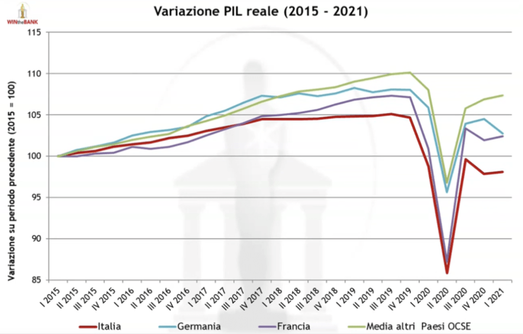 Variazione del PIL reale dal 2015 al 2021 – “Cos’è il PIL reale? Diciamo l’effetto più puro, autentico di quanto uno Stato riesce a produrre di ricchezza. Qui stiamo parlando dei paesi OCSE. Da questo grafico possiamo vede come noi, l’Italia, siamo il fanalino di coda e la curva è speculare, cioè tutti i paesi del mondo hanno tendenzialmente lo stesso andamento. Quello che è importante è che l’Italia ha avuto un calo del 20%. Dicono che l’Italia sia davanti a tutti nella ripresa? A me non sembra”.