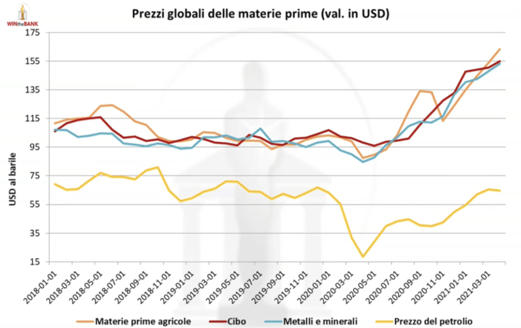 Come sono variati i prezzi delle materie prime negli ultimi 3 anni?: “Tra il 2020 e il 2021 schizza verso l’alto le materie prime agricole, il cibo e anche i metalli e minerali mentre il prezzo del petrolio tende a rimanere stabile. Se fai crescere il prezzo delle materie prime, oltre a disoccupazione e licenziamenti, poi succedono dei fenomeni che possono avere un impatto devastante sulla società civile. Leggevo questa mattina ‘il Governo aiuterà la famiglia e le imprese alla svolta green’, anche questo io lo dicevo da mesi”.