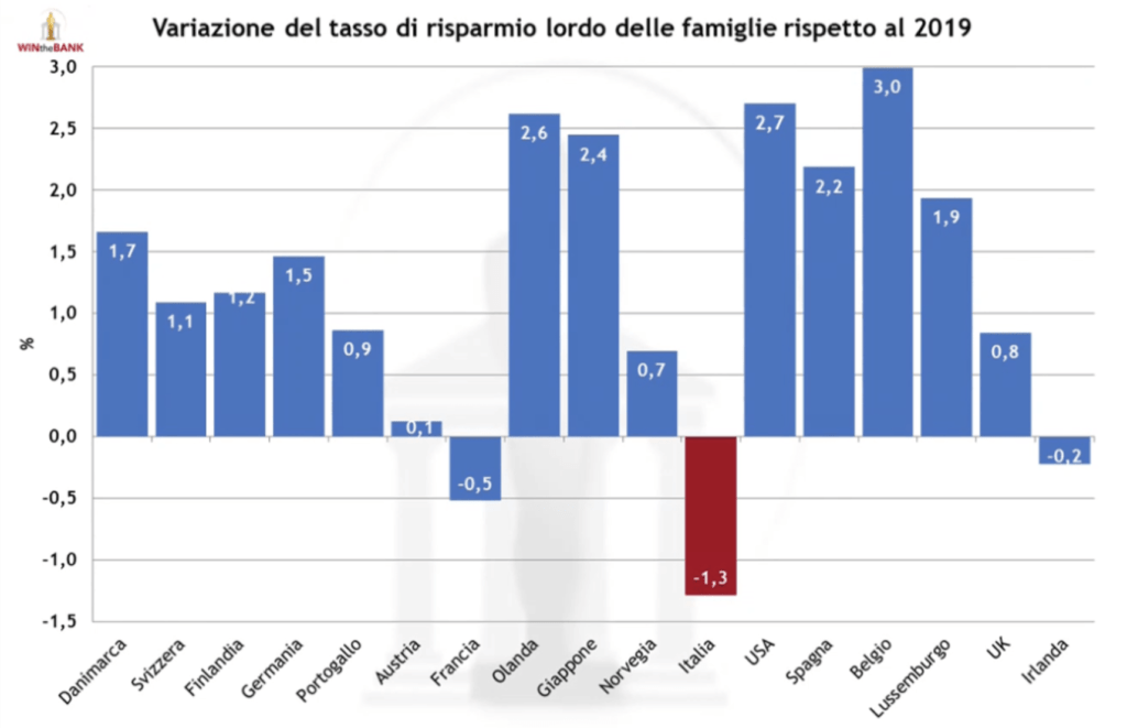 Com’è variato il risparmio delle famiglie del 2020 rispetto al 2019?: “Questo è il dato importante. Per vedere se un’economia è sana bisogna vedere il risparmio, non il consumo. Io posso anche consumare indebitandomi e questo è quello che è successo al nostro paese che avrà una crisi da debito privato, non pubblico. Quello che bisogna guardare è la variazione del tasso di risparmio lordo delle nostre famiglie.