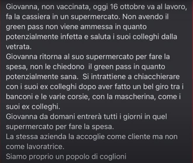 Sai cosa succederà adesso? Tra poco non ci faranno andare neanche più a fare la spesa senza il Green Pass. Il livello di totalitarismo è tale che tra poco non ci faranno neanche più entrare al supermercato. Questa è la mia sinistra profezia, conosco i miei polli. Questo è l’obiettivo a cui tendono. Sappiatelo”.