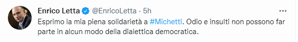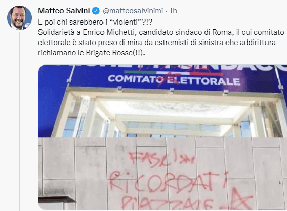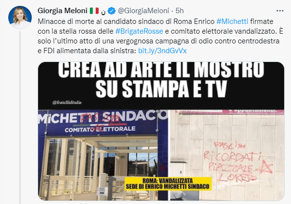 “Stelle a cinque Punte delle Brigate Rosse e minacce di morte contro di me. Sono sconcertato. Il nostro comitato è stato profanato e vandalizzato con le stelle a cinque punte delle Brigate Rosse e richiami a Piazzale Loreto“: questo il comunicato emesso dal candidato a Sindaco di Roma Enrico Michetti. “Adesso basta, non accetterò più attacchi che hanno addirittura portato a queste intimidazioni e minacce che offendono la mia persona e che mettono in pericolo la democrazia. Questa – chiude la nota – è una vergogna“.