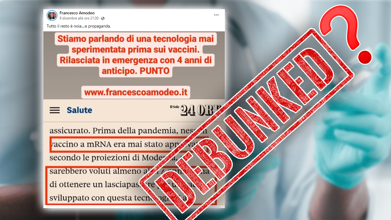 Ho pubblicato recentemente uno screenshot di un articolo apparso su “Il Sole 24 Ore” dove si legge che prima della pandemia nessun vaccino a mRNA era mai stato approvato “e secondo le proiezioni di Moderna“, continua l’articolo, “ci sarebbero voluti almeno altri 4 anni prima di ottenere un lasciapassare per un vaccino sviluppato con questa tecnologia“.