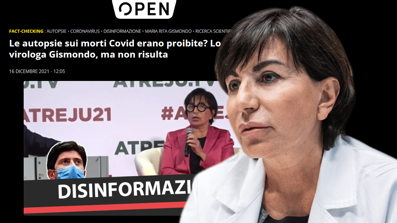 La vicenda è stata riportata alla luce dalla virologa Maria Rita Gismondo in occasione di un intervento ad Atreju 2021, la kermesse organizzata da Fratelli d’Italia. “Ci è stato proibito” ha denunciato la dottoressa, citando la circolare ministeriale che sconsigliava fortemente questo tipo di azione. Il passaggio di Gismondo è diventato presto virale sul web ed è stato poi oggetto di un cosiddetto fact-checking per mano della testata Open. Etichettata come disinformazione, la versione della direttrice del Laboratorio di microbiologia clinica dell’ospedale Sacco di Milano è stata oggetto di un presunta operazione verità dal titolo “Le autopsie sui morti Covid erano proibite? Lo afferma la virologa Gismondo, ma non risulta”.