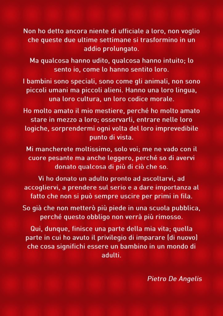 Nelle sue ultime parole da insegnante, il pensiero corre ancora ai suoi alunni, coloro per i quali ha speso tutta la propria vita lavorativa. Un impegno costante mirato a garantire sempre il meglio per i propri studenti, spendendo anche in prima persona denaro e risorse personali per colmare le lacune dei fondi della scuola pubblica. Poche sporadiche parole d’interessamento da colleghi e personale scolastico per il suo obbligato addio, solo negli occhi dei suoi bambini ha colto il senso di smarrimento e il loro affetto. “Ho molto amato il mio mestiere, ho molto amato stare in mezzo a loro” scrive il professore De Angelis “mi mancherete moltissimo. Qui finisce una parte della mia vita, quella parte in cui ho avuto il privilegio di imparare cosa significhi essere un bambino in un mondo di adulti“.