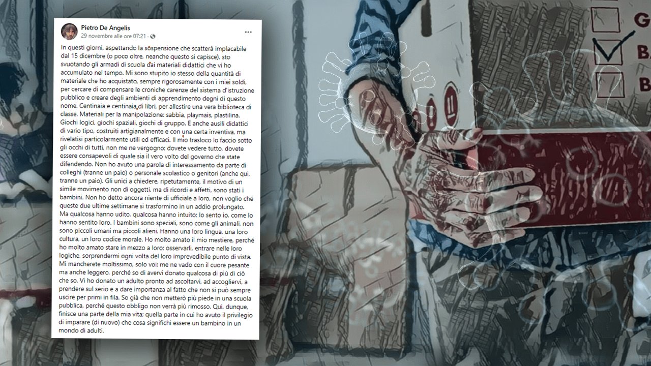 Un lungo post di commiato. Le parole del prof. Pietro De Angelis sono piene di affetto per i suoi alunni ma anche di amarezza. L’impegno e la passione per i suoi studenti non è bastato, la sospensione per aver rifiutato l’obbligo vaccinale lo costringerà a lasciare, forse per sempre, l’insegnamento dal 15 dicembre. Solo due settimane per dire addio ai suoi bambini e lasciare, probabilmente in maniera definitiva un tassello fondamentale della sua vita.