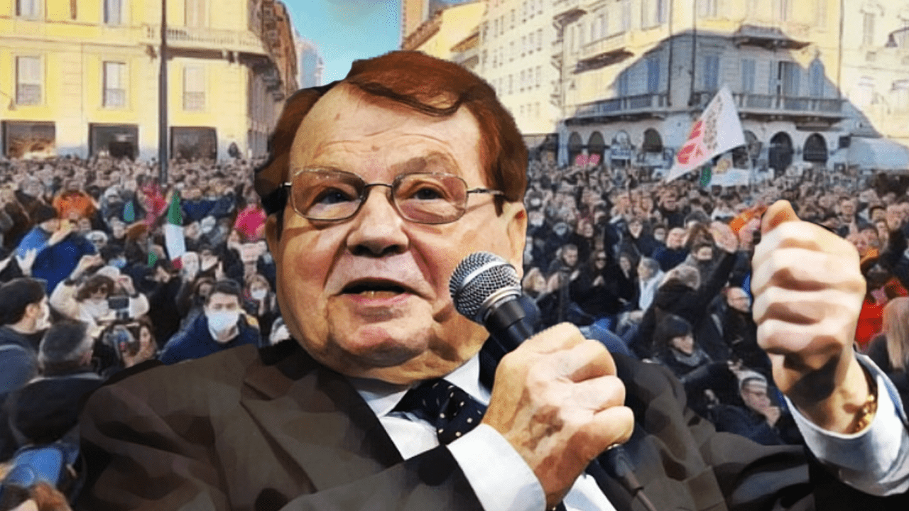 Milano, il premio Nobel Montagnier prende la parola nel palco tra la folla. I manifestanti sono giovani, anziani, adulti, scesi in strada per manifestare il loro dissenso contro gli obblighi imposti dal governo Draghi sulla vaccinazione.