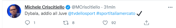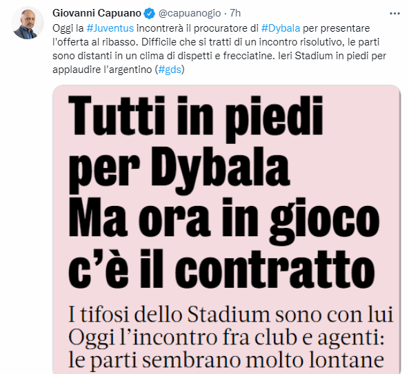 Una persona molto informata di vicende juventine, anche se non più direttamente a all’interno, mi dice da tempo che Dybala lascerà i bianconeri e andrà all’Inter. Questo risulta a me. Anche io penso che la Juventus lo rimpiangerà e lui, quando gioca e sta bene, è davvero delizioso.