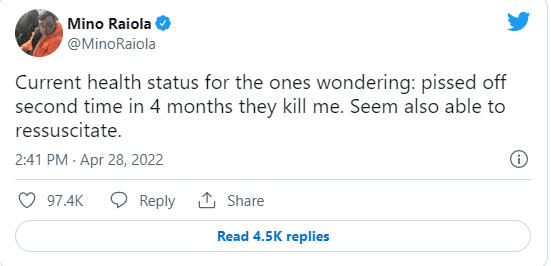 Il protagonista della notizia Mino Raiola, ha appena rilasciato un tweet sul suo profilo ufficiale nel quale con un tono ironico e pungente smentisce la notizia: “E’ la seconda volta che mi uccidono in quattro mesi”