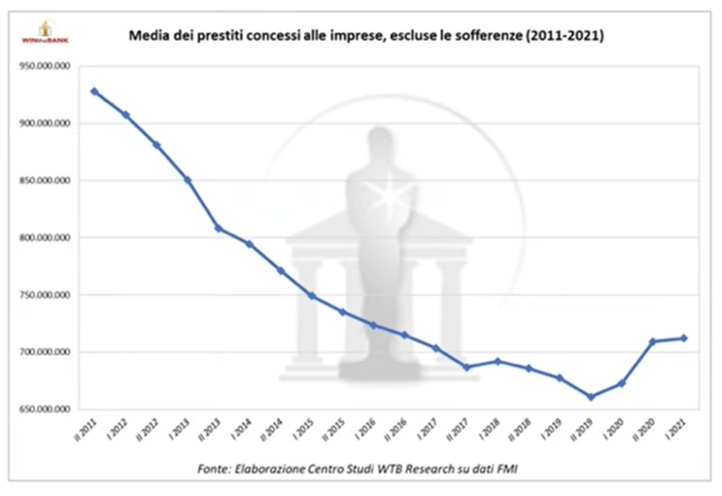 Media dei prestiti concessi alle imprese, escluse le sofferenze (2011-2021). Quali sono le prospettive per le imprese italiane? “Io da tanti anni parlo del termine Credit Crunch, ossia restrizione creditizia. Dal 2011 al 2021 il trend è molto chiaro, si vede un crollo dei prestiti fatti dal sistema bancario alle imprese dopo l’arrivo del Governo Monti e l’introduzione di quello che viene definito come periodo dell’Austerity, momento nel quale noi dobbiamo ridurre la spesa pubblica e aumentare le tasse. Sul sistema privato questo ha comportato (in riferimento a tutto quello che è stato costruito per la tutela del consumatore) una restrizione del credito, cioè le aziende hanno avuto meno denaro.