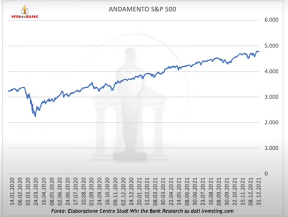 Andamento S&P 500. Nel mercato delle grandi imprese cosa succede invece?: “Dal 14 gennaio del 2020 al 31 dicembre del 2021 accade questo: il 6 febbraio il trend è ancora in aumento, poi c’è un crollo dell’andamento Standard & Poor (il principale mercato borsistico noto). Le imprese di grande dimensioni, le multinazionali, in sostanza il mondo della borsa perciò come reagisce al Covid? Al 2 di giugno 2020 era finito, dopo finito l’effetto del crollo l’effetto borsistico riparte come se nulla fosse”.