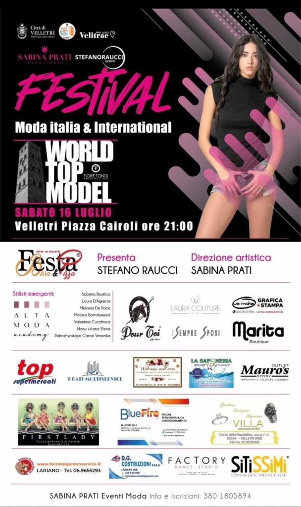 Sabato 16 luglio in piazza Cairoli a Velletri a partire dalle ore 21 torna il Festival Moda Italia & International. L’evento, patrocinato dal comune e dalla Pro Loco di Velletri e inserito nel programma della Festa della Birra e della Pizza, ospita al suo interno una tappa ufficiale del contest di bellezza mondiale World Top Model. Alcune delle modelle partecipanti infatti, andranno di diritto alla finale nazionale in programma a settembre in Puglia al Resort di lusso La Casarana e in platea ad applaudire e ad assistere ci sarà anche il patron del contest Fiore Tondi.