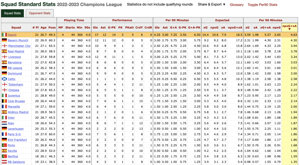 E c’è di più: i dati incoronano il Napoli come squadra più pericolosa di tutta la Champions League. Più del faraonico Manchester City di Pep Guardiola, più del Bayern Monaco schiacciasassi di Julian Nagelsmann, più dei campioni in carica, il Real Madrid dell’ex Carlo Ancelotti. Per capire di cosa parliamo, occorre una digressione sui numeri.