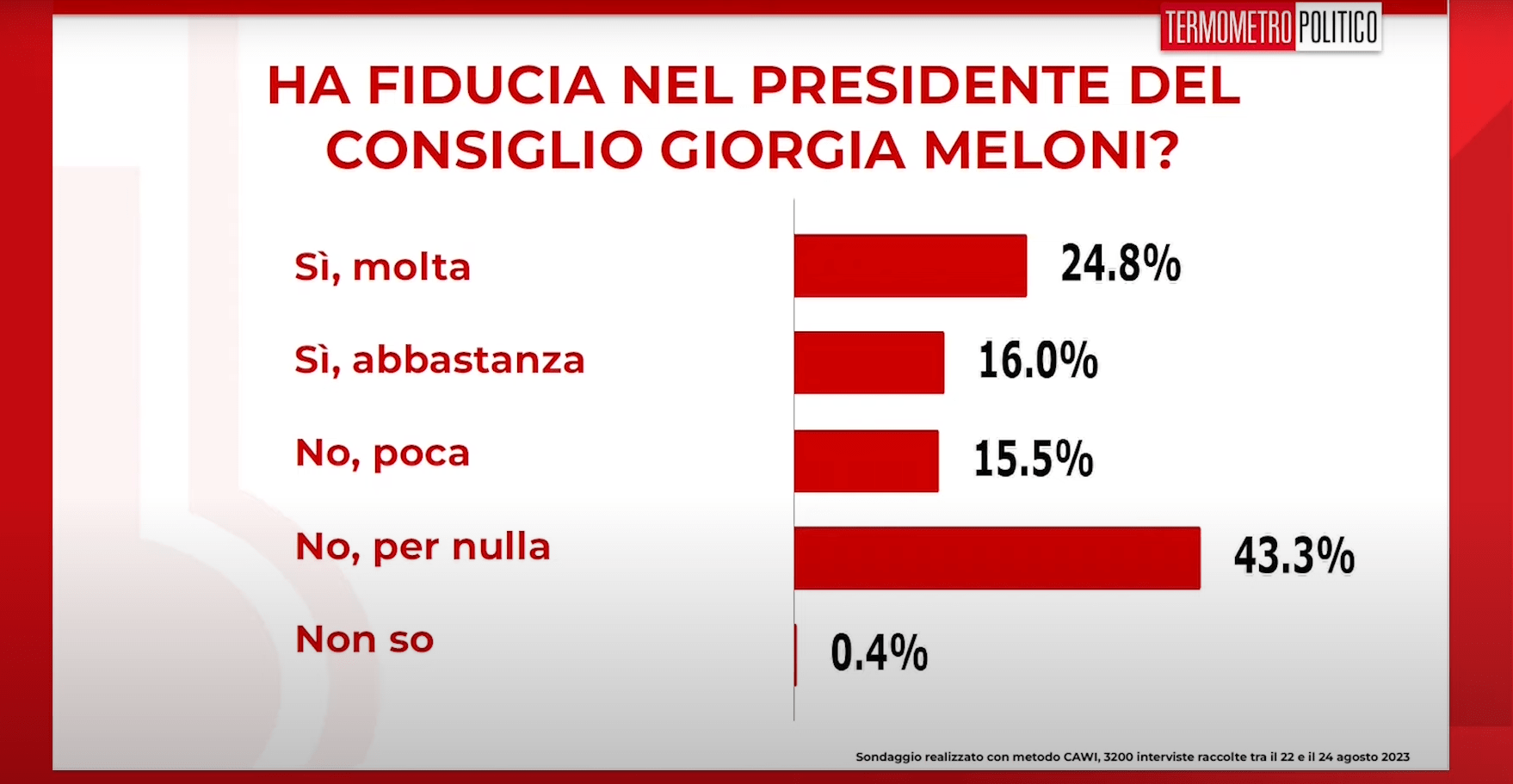 Gianluca Borrelli, editore e fondatore de ‘Il termometro politico‘, progetto di informazione politica e sociale incentrato sui sondaggi, commenta questa tendenza e fornisce i dati: “Il consenso nei confronti della Meloni sta scendendo, le persone che non hanno alcuna fiducia in questo governo raggiungono una percentuale intorno al 43%. Rispetto ai governi precedenti, che riscontravano percentuali simili a fine mandato, Meloni ha perso fiducia piuttosto velocemente“.