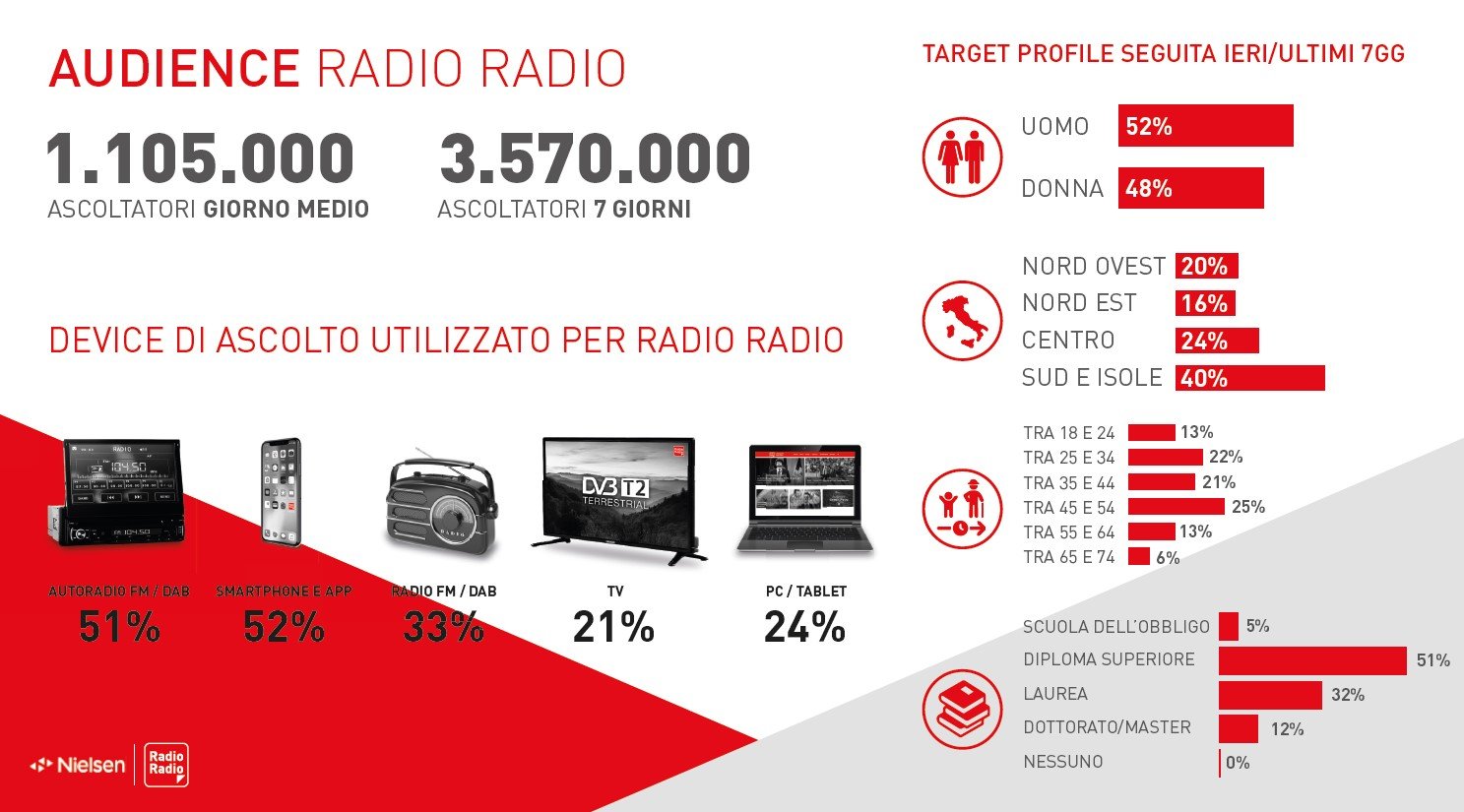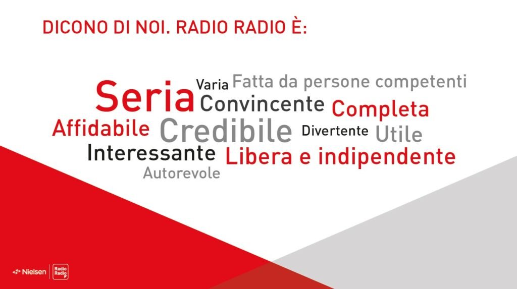 Radio Radio non è iscritta a TER. E non si iscrive nemmeno alla ricerca del 2024. I motivi sono di tipo metodologico e peraltro molto ben sintetizzati nel comunicato stampa con cui la Rai ha abbandonato e chiuso con la società. Da anni l’emittente commissiona a Nielsen, una società di tipo internazionale e notevole per affidabilità, sia la rilevazione dei propri ascoltatori che anche l’analisi di aspetti qualitativi che riguardano sia la fruizione dei programmi che della pubblicità. Target adulto 25-54 anni, maschile/femminile, scolarità elevata. Radio Radio ha tutti i numeri.