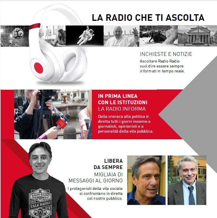 Una realtà che parte da Roma ma che ha un respiro sempre più nazionale. Una identità forte nella serietà e nella indipendenza al servizio del pubblico con un doppio motore editoriale Talk & Sport. E’ il momento di parlare. E’ il momento di RADIO RADIO.