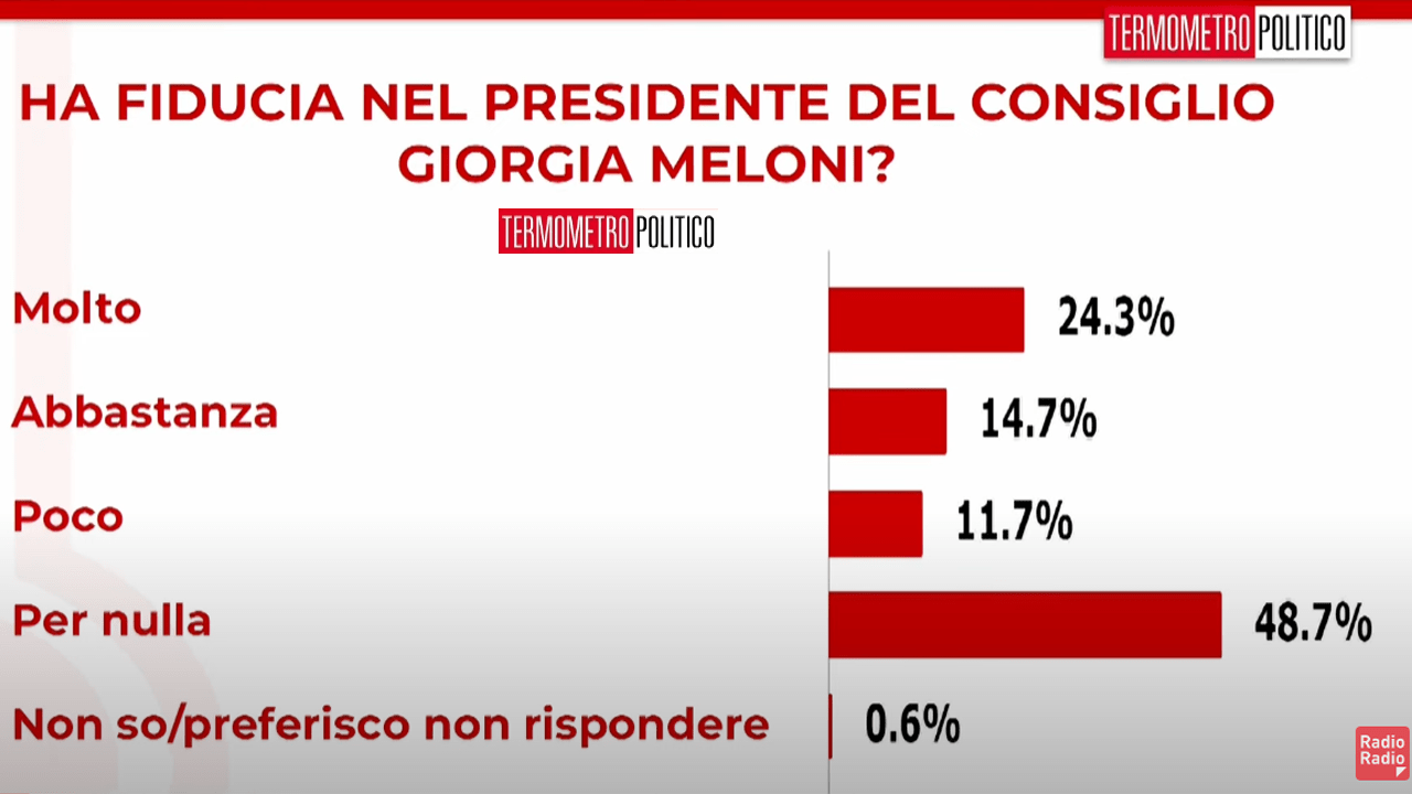 La domanda che ‘Termometro Politico’ ha rivolto agli italiani è la seguente: ‘Ha fiducia nel presidente del consiglio Giorgia Meloni?’