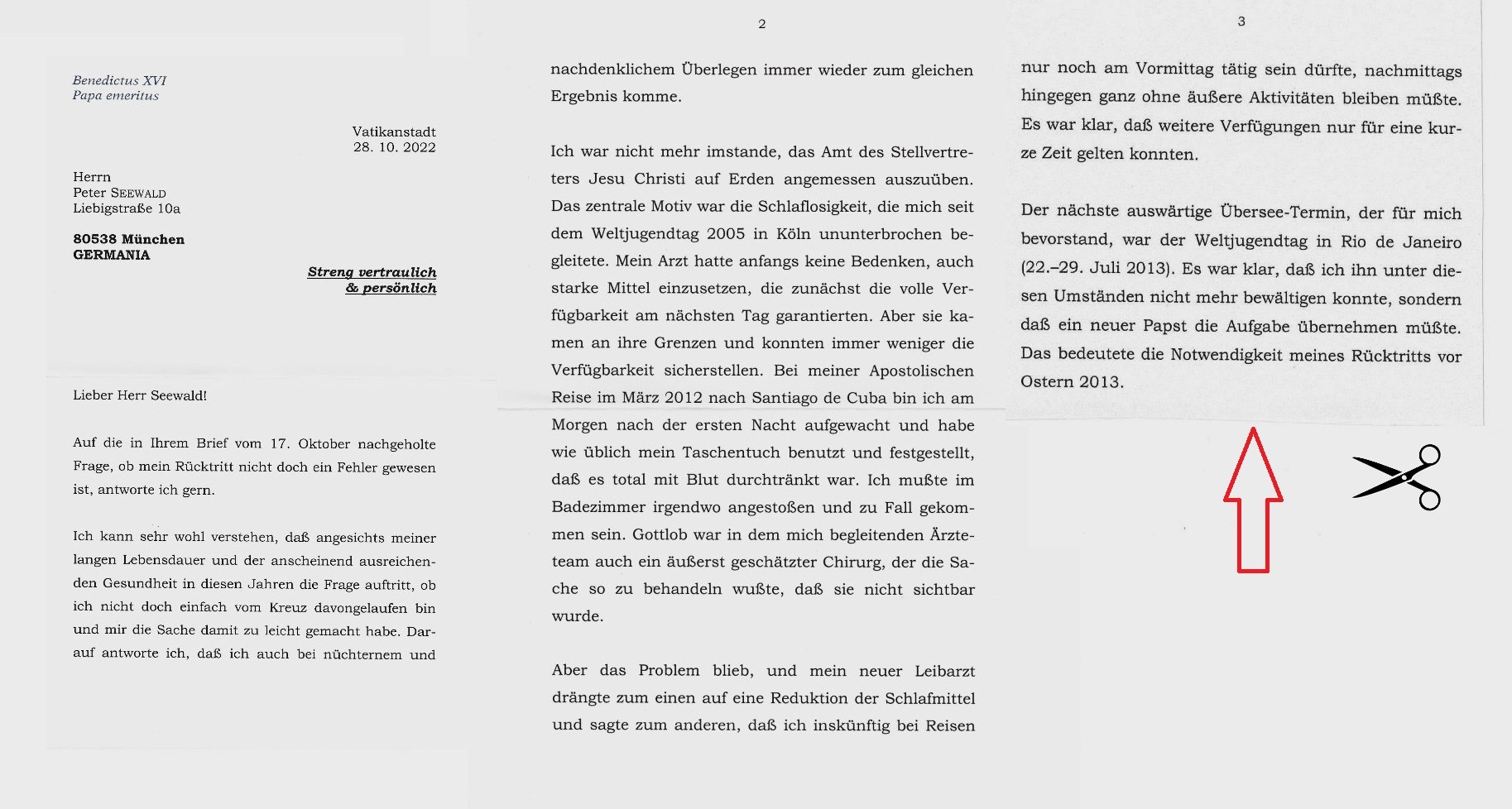 Cionci si è fatto mandare da Seewald l’originale della lettera (sebbene privata di mezza pagina finale) in cui Papa Benedetto afferma che già dal 2005 assumeva farmaci in alte dosi per dormire.