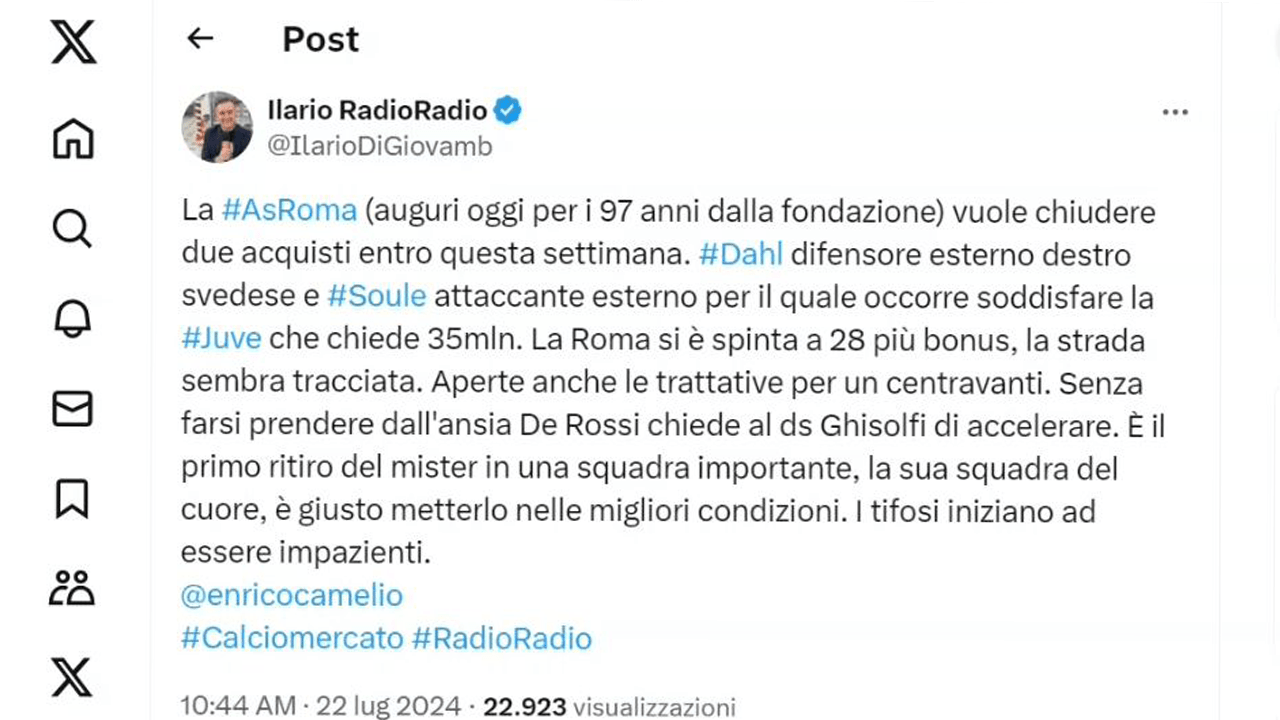 Senza farsi prendere dall’ansia, De Rossi chiede al DS Ghisolfi di accelerare. È il primo ritiro del mister in una squadra importante, la sua squadra del cuore. È giusto metterlo nelle migliori condizioni. I tifosi iniziano ad essere impazienti”.