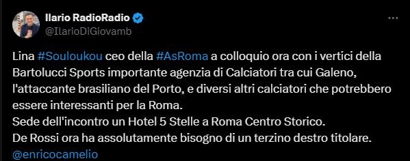 “Lina Souloukou ceo della As Roma a colloquio ora con i vertici della Bertolucci Sports, importante agenzia di Calciatori tra cui Galeno, l’attaccante brasiliano del Porto, e diversi altri calciatori che potrebbero essere interessanti per la Roma. Sede dell’incontro un Hotel 5 Stelle a Roma Centro Storico. De Rossi ora ha assolutamente bisogno di un terzino destro titolare“.