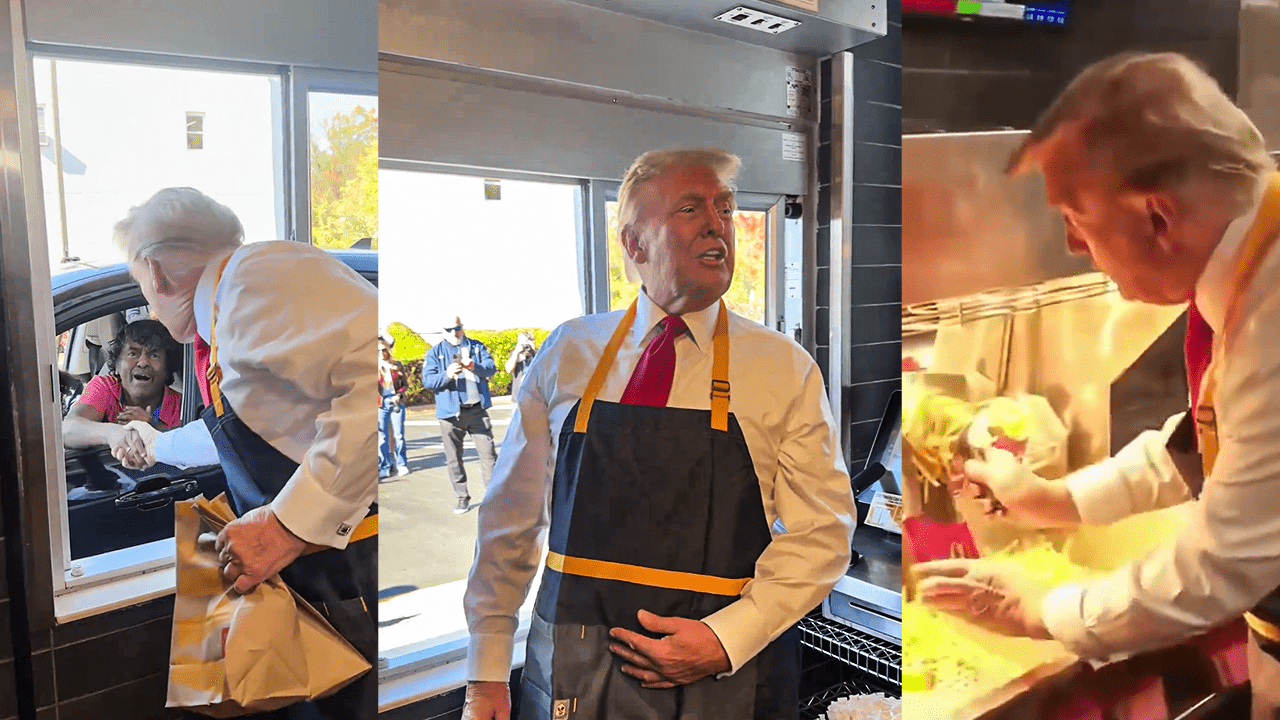 Così Donald Trump frigge patatine e le serve alla finestra del Drive, dove le persone rimangono di stucco quando si ritrovano davanti l’ex Presidente degli Stati Uniti.