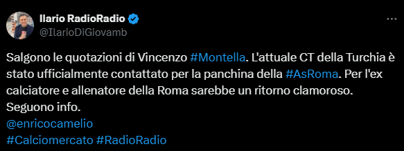 Montella, attualmente commissario tecnico della Turchia, ha diversi fattori a suo favore: conosce bene l’ambiente romano, avendo giocato nella Roma da calciatore e avendola già allenata brevemente nel 2011. Ha poi un’idea tattica precisa (4-2-3-1) che potrebbe adattarsi bene alla rosa attuale; è inoltre considerato un tecnico “pronto subito”, con esperienza in Serie A, e potrebbe liberarsi dall’impegno con la nazionale turca pagando una penale.