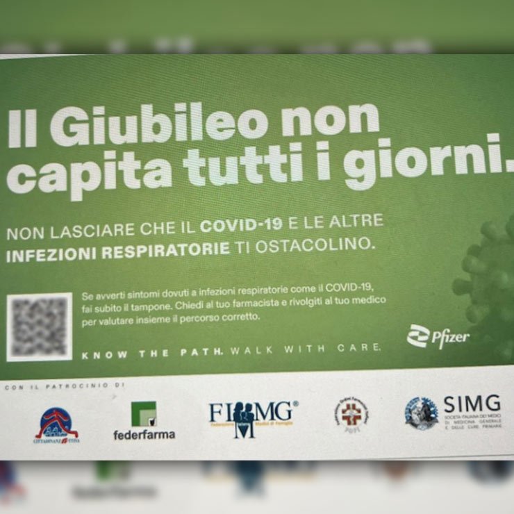 Roma si attende oltre 35 milioni di pellegrini rivolti verso il Giubileo. Per questo Big Pharma ci tiene ad avvisare sul rischio di contagio da Covid e altre malattie respiratorie. E’ infatti partita una nuova campagna di sensibilizzazione della nota casa farmaceutica Pfizer, e patrocinata da Cittadinanzattiva, Federfarma, Fimmg, Fofi e Simg. “Il Giubileo non capita tutti i giorni”, si legge nei manifesti affissi in autobus, nelle stazioni ferroviarie, nelle metropolitane, in farmacia e sui social. “Non lasciare che il Covid-19 e le altre infezioni respiratorie ti ostacolino“. Il consiglio è quello di fare subito il tampone se si avvertono sintomi, e chiedere al medico per “valutare insieme il percorso corretto”.