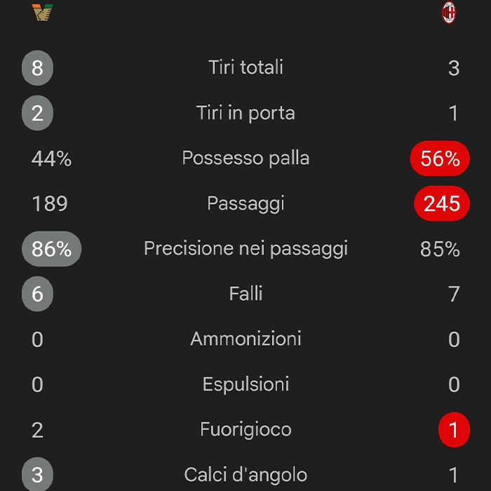 Il Venezia crea e gioca; il Milan segna e vince la partita. Può essere riassunta così una partita in cui i rossoneri, dopo il trionfo in semifinale di Coppa Italia con l’Inter, riescono a portare casa l’intera posta in palio. Decisamente con troppa fatica però. E le statistiche alla fine del primo tempo ne rappresentano la conferma.