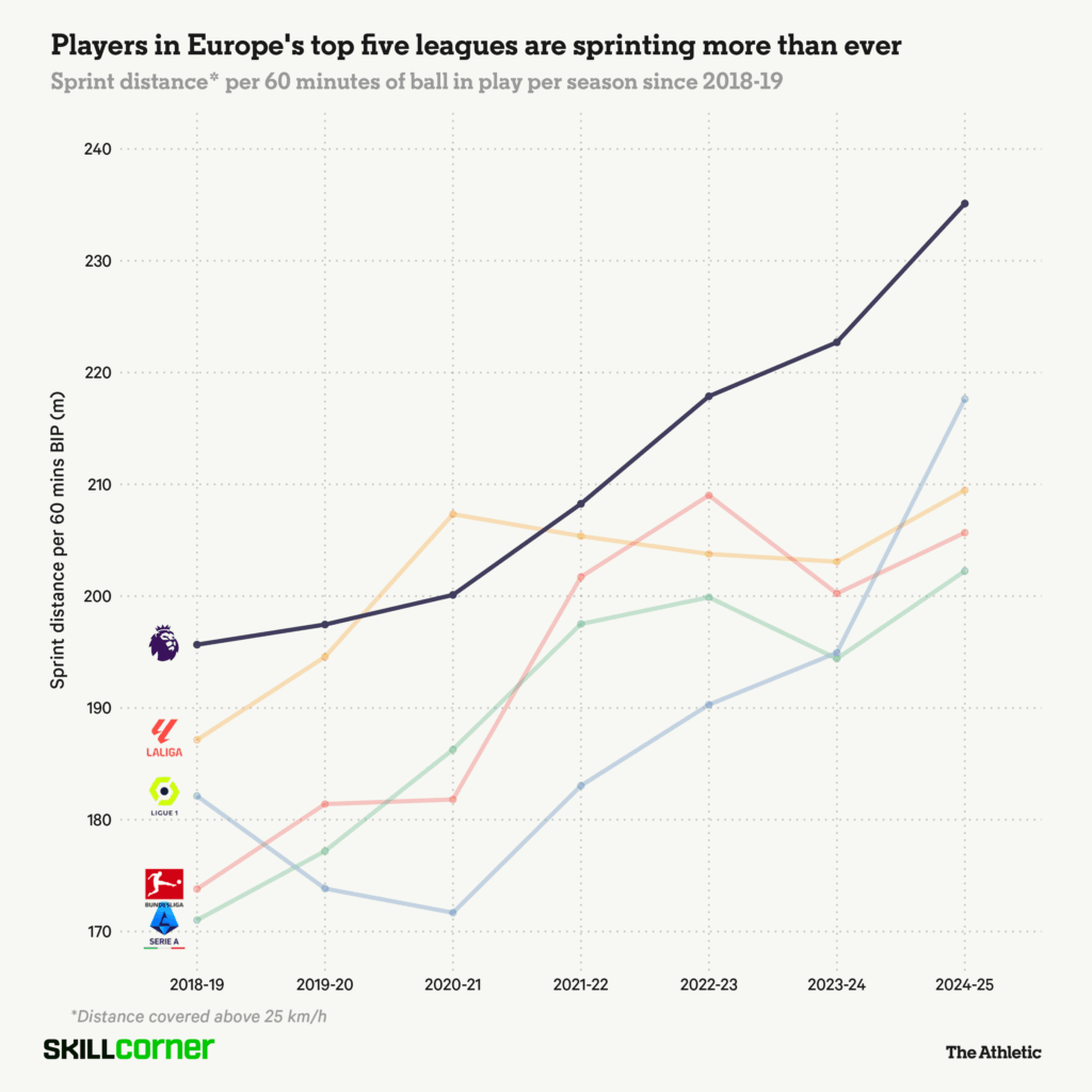 È chiaro che il calcio sia diventato via via più rapido da decenni, e i cinque cambi non sono l’unica causa. Ma negli ultimi cinque anni l’accelerazione è stata particolarmente evidente.