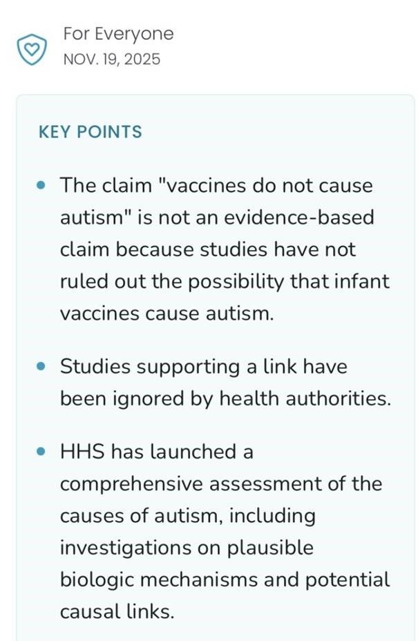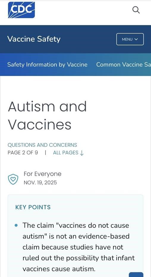 Il passaggio del CDC americano del 19 novembre sulle correlazioni tra vaccini e autismo infantile rappresenta, nella lettura di Holzeisen, la conferma definitiva di anni di omissioni. “Il CDC dichiara finalmente sul sito web che la dichiarazione che i vaccini non causano l’autismo non è basata scientificamente”, afferma, sottolineando come l’agenzia abbia abbandonato la formula assolutoria utilizzata per decenni. Per lei, si tratta di un’ammissione esplicita: la sicurezza proclamata non era fondata su prove solide, ma su una narrazione costruita.