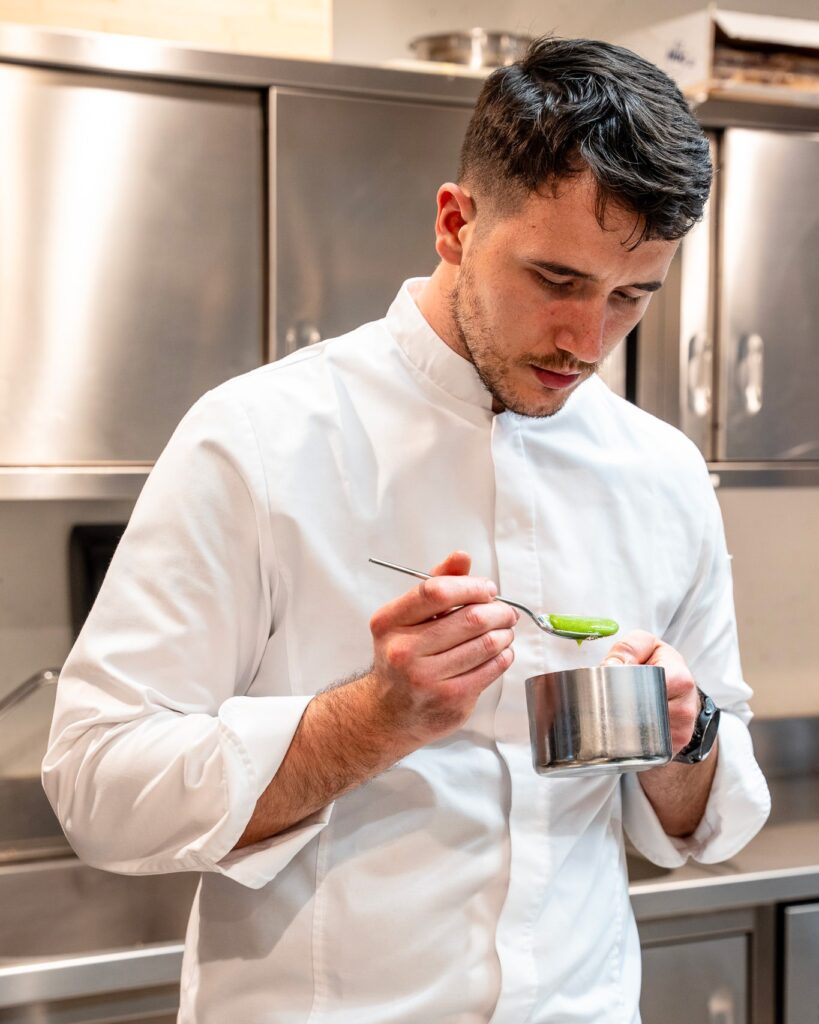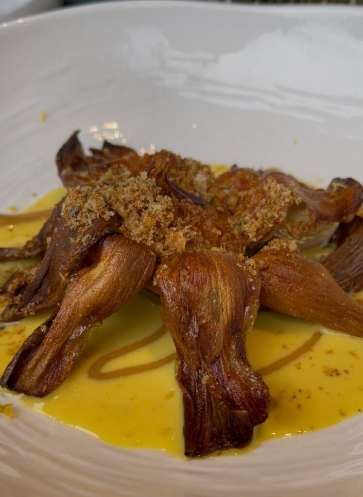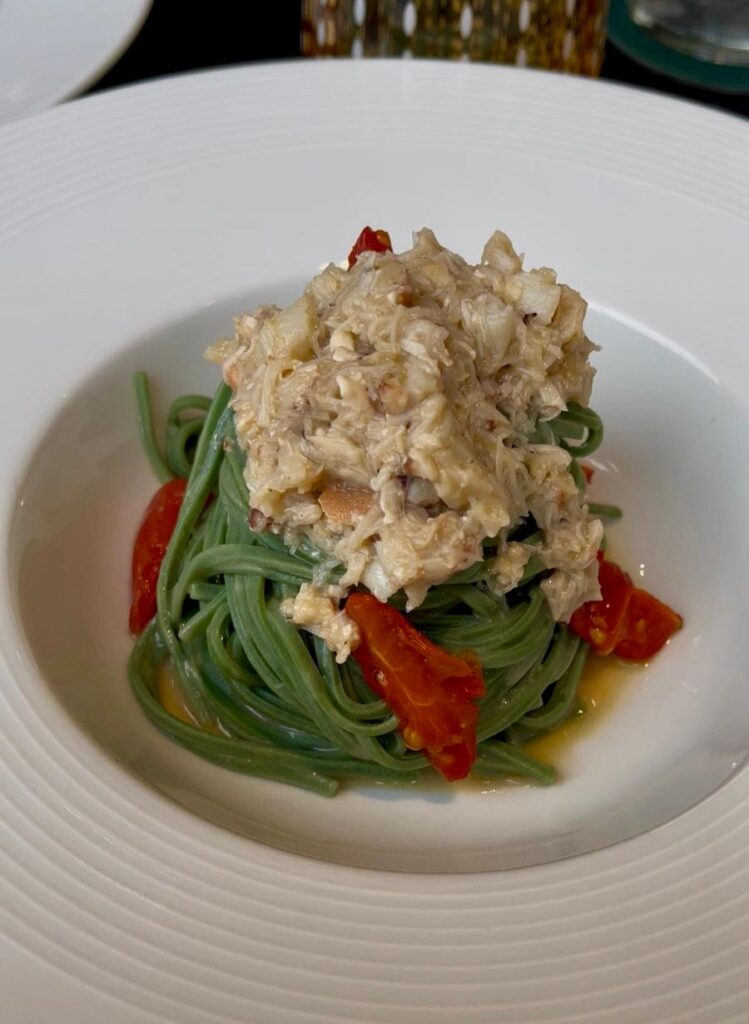 Le linguine al granciporro sono mantecate nel brodo ottenuto dalle carcasse e nel dashi, un piatto di grande profondità marina, avvolgente e intenso. È lo chef a confessarci che la carne viene aggiunta solo sul finale, per preservare le proprietà nutritive. La pasta, di un verde tenue, richiama la fascia costiera in cui vive il protagonista del piatto.