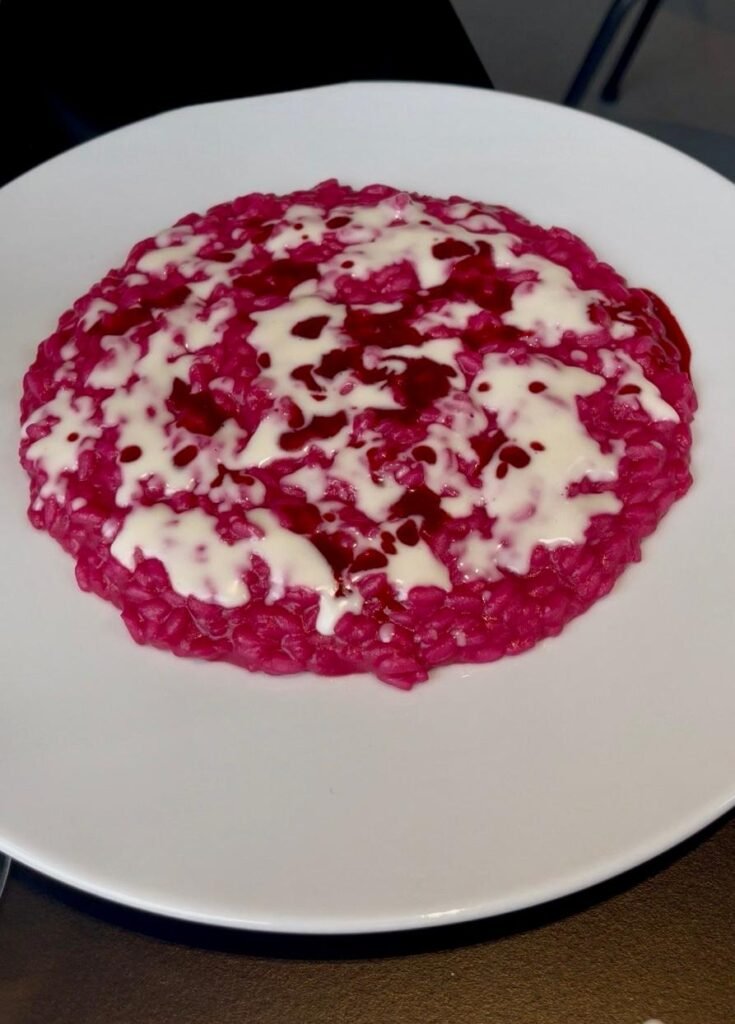 Varcata la soglia del ristorante, veniamo accolte da Abbate, il sommelier di kùm, che ci accompagna al nostro tavolo. Con calma, lasciamo libera scelta allo chef. Eppure, una rapida occhiata al menù decidiamo di darla: tra le proposte spiccano piatti che uniscono armonia, colore e gusto, capaci di esprimere la filosofia del ristorante in un unica portata. Il risotto alla barbabietola con fonduta di parmigiano e riduzione ai frutti rossi cattura l‘occhio e il palato. Il colore intenso colpisce e, al primo assaggio, emerge la mano delicata dello chef: nessun sapore predomina sull’altro. La nota dolce e terrosa della barbabietola viene equilibrata dalla fonduta sapida di parmigiano, mentre l’acidità della riduzioni ai frutti rossi rende il boccone dinamico.