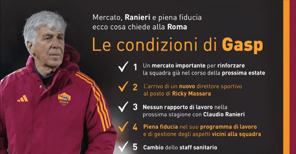 Gasperini detta le condizioni ai Friedkin per restare sulla panchina della Roma, con cui è legato da un contratto da 5 milioni di euro netti a stagione fino al 2028. Secondo quanto riportato dalla Gazzetta dello Sport, il tecnico ex Atalanta avrebbe chiesto piena fiducia e più poteri, compreso il controllo sullo staff medico, un budget importante per il mercato estivo, un direttore sportivo diverso da Massara e — punto cruciale — nessun rapporto di lavoro con Claudio Ranieri.